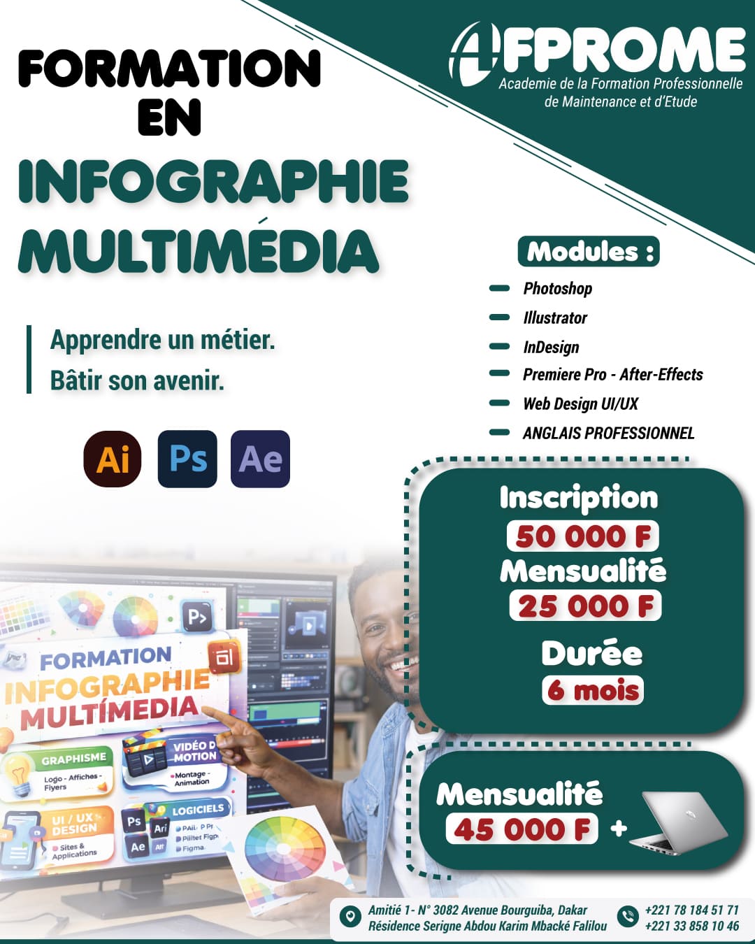 La formation en Infographie d’AFPROME initie les apprenants aux techniques de conception graphique et à l’utilisation des logiciels professionnels tels que Photoshop, Illustrator et InDesign. Elle combine théorie et pratique pour permettre aux stagiaires de créer des visuels impactants : logos, affiches, flyers, bannières web et supports multimédias.